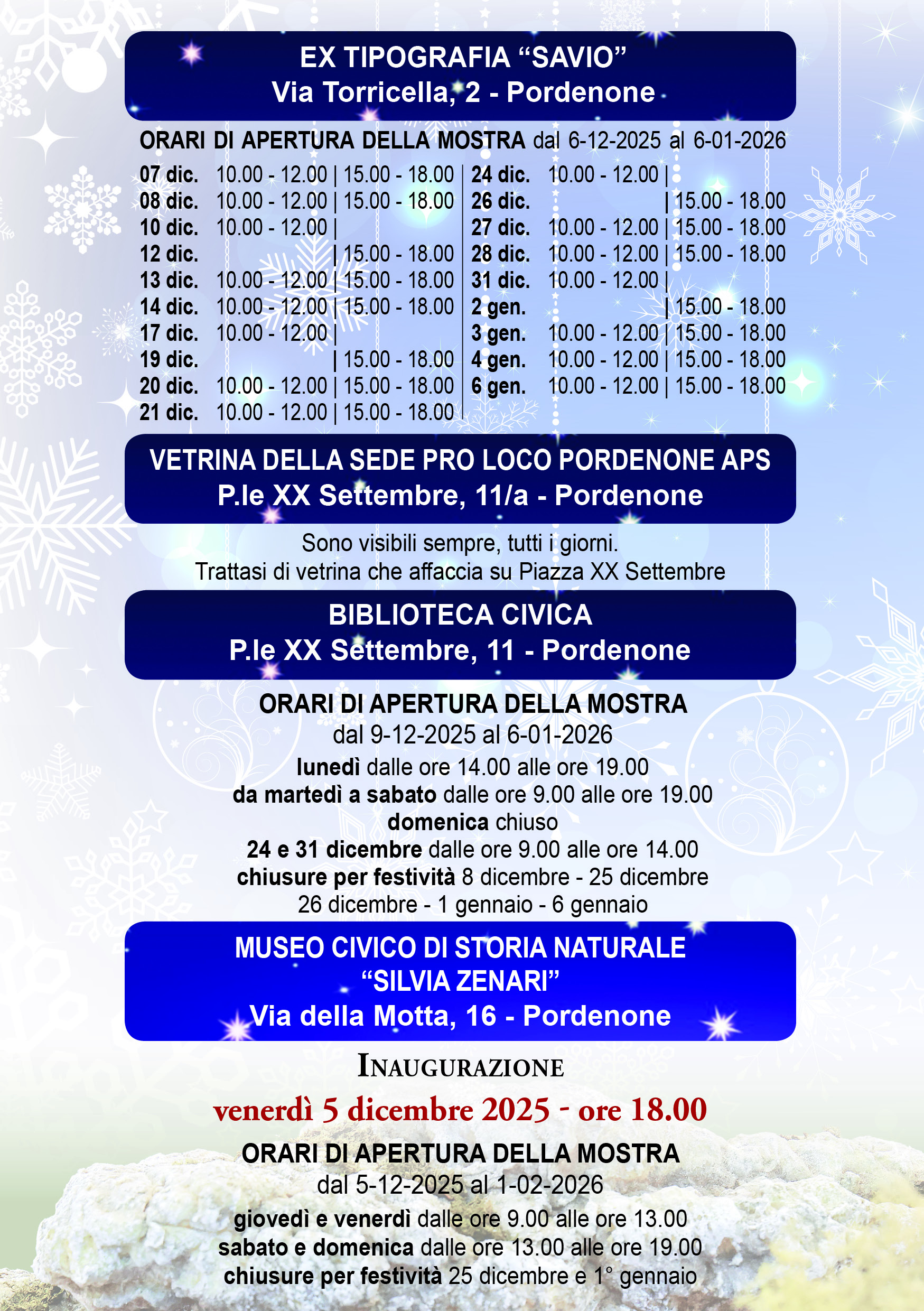 Sabato 27 dicembre 2025 ore 10.00 - 12.00 e 15.00 - 18.00